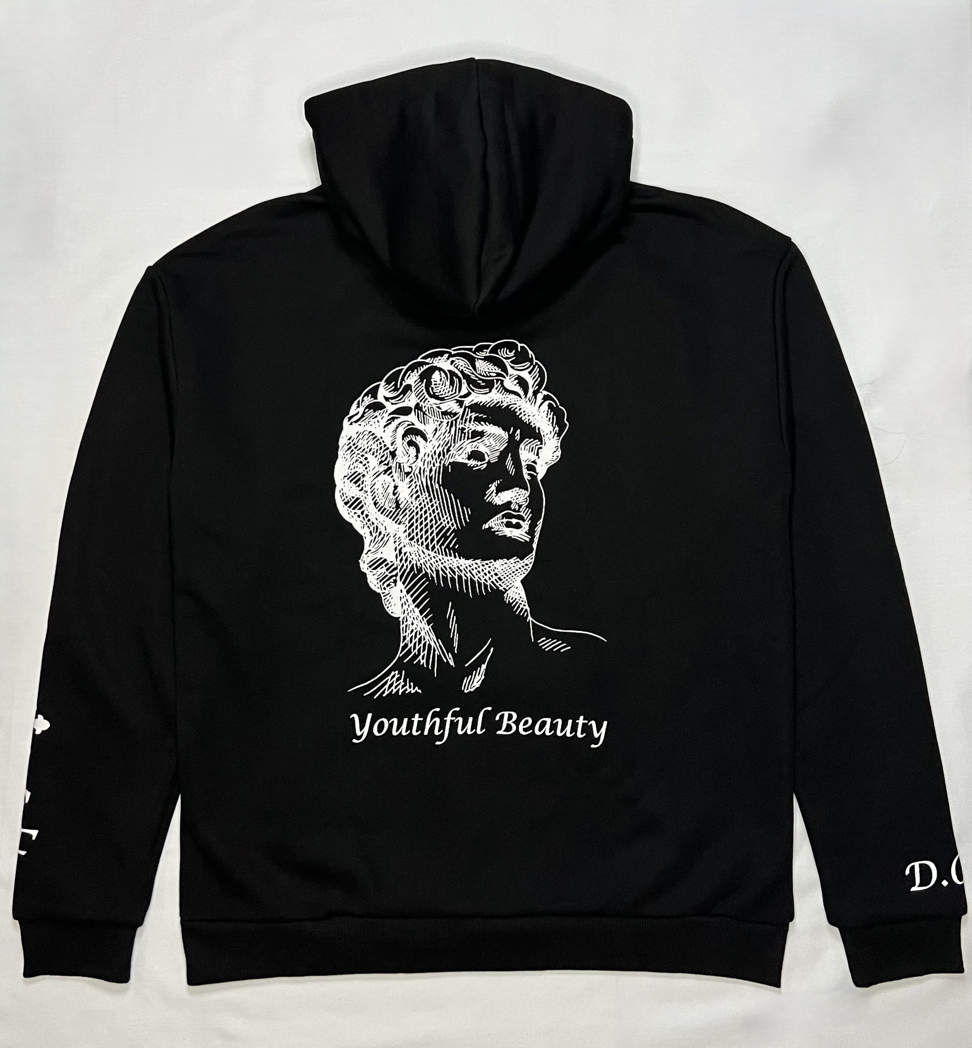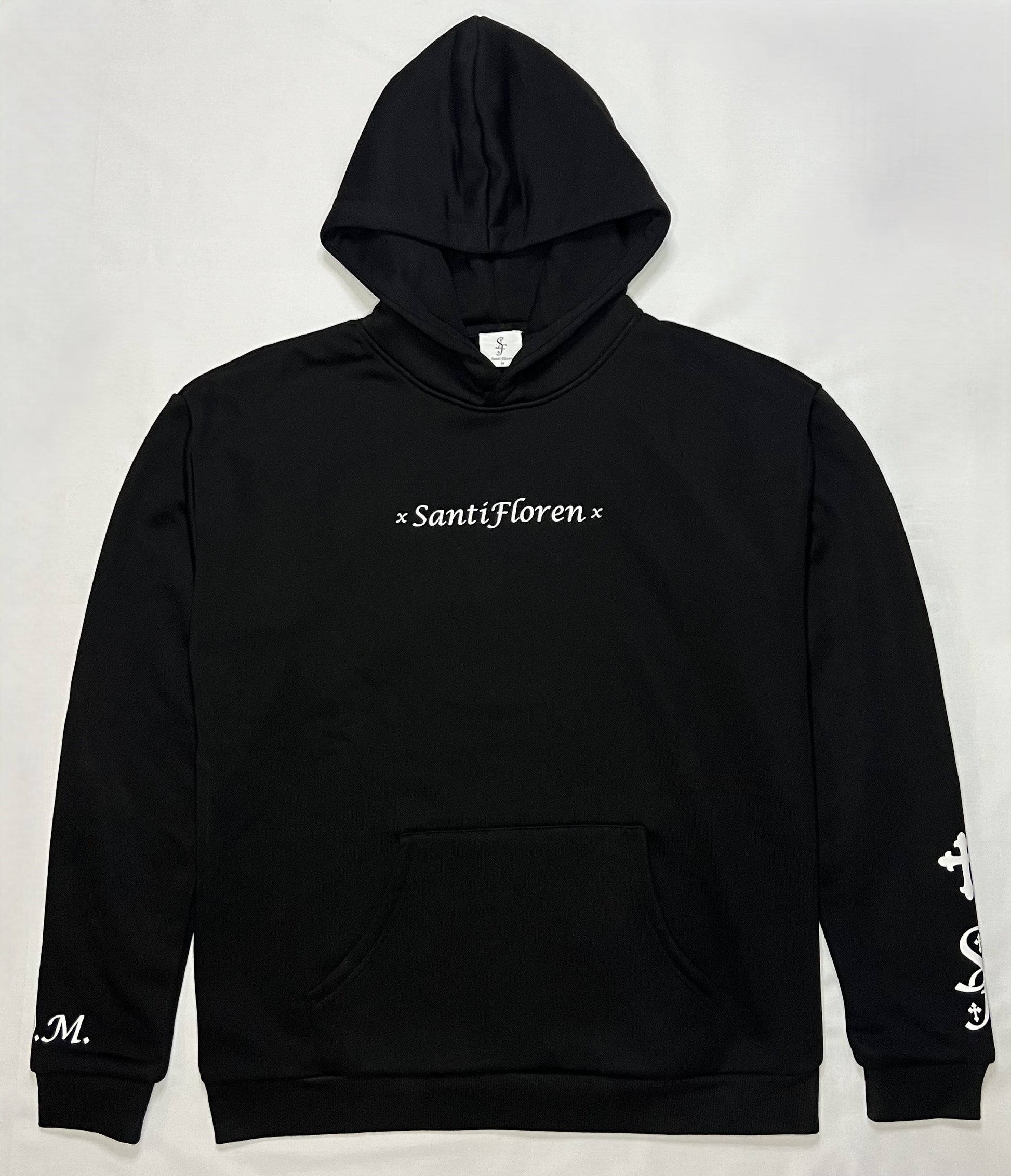 Our David Of Michelangelo hoodie from SantiFloren comes in slight oversize unisex sizes. This style features the SantiFloren name with David of Michelangelo printed on the back. D.O.M. on the right sleeve of the hoodie with a cross and SantiFloren logo on the left sleeve.